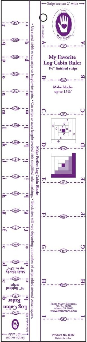 MARTI MICHELL-Log Cabin Ruler. Use this ruler to rotary cut squares and strips to the exact length for perfect log cabin blocks! This package contains one 15x3-3/4 inch log cabin ruler with 3/4 inch and 1-1/2 inch finished strip sizes. Made in USA. WARNING: This product can contains chemicals including Poly(methyl methacrylate), which is known to the State of California to cause cancer. For more information go to www.P65Warnings.ca.gov.