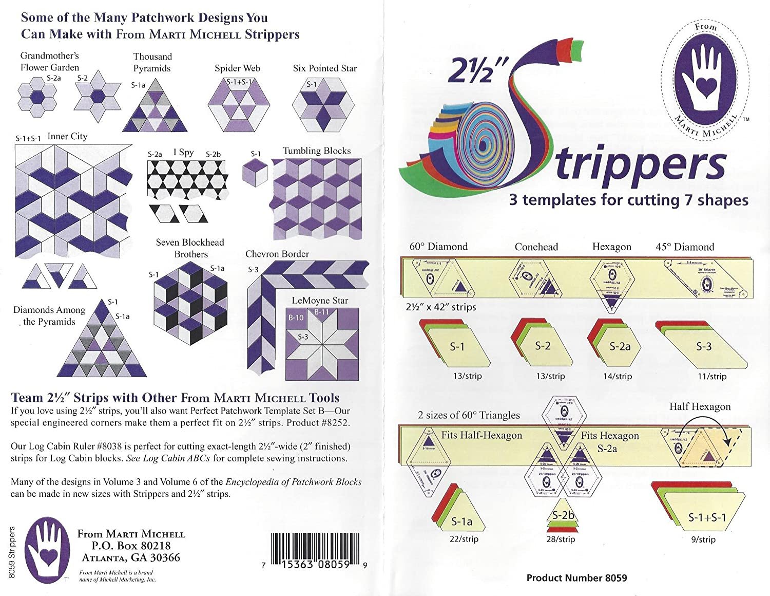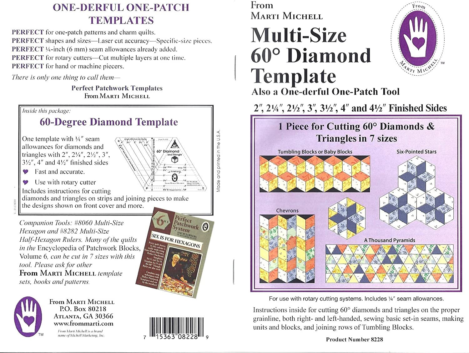 - INCLUDES 2 Marti Michell Perfect Patchwork System Templates: 2 ½-Inch Strippers Templates (8059) and One-derful One Patch 60-Degree Diamond and Triangle Template (8228)