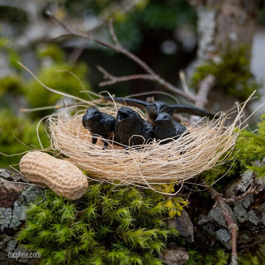 GIVE A MURDER AS A HOUSEWARMING PRESENT It’s a set of four perfectly posed crow figures! Sure, a group of crows is called a murder, but that doesn’t mean that they have homicidal intent. This set of four different crows can decorate your space or sit comfortably in the matchbox style package they come in. Each of these corvid cuties is made of hard vinyl and is between 1" to 1-1/4" tall. Did you know if you fly crow airlines they’ll let you bring as much carrion luggage as you’d like. These look especially good posed around peanuts. Comes in an illustrated box that includes a nest!