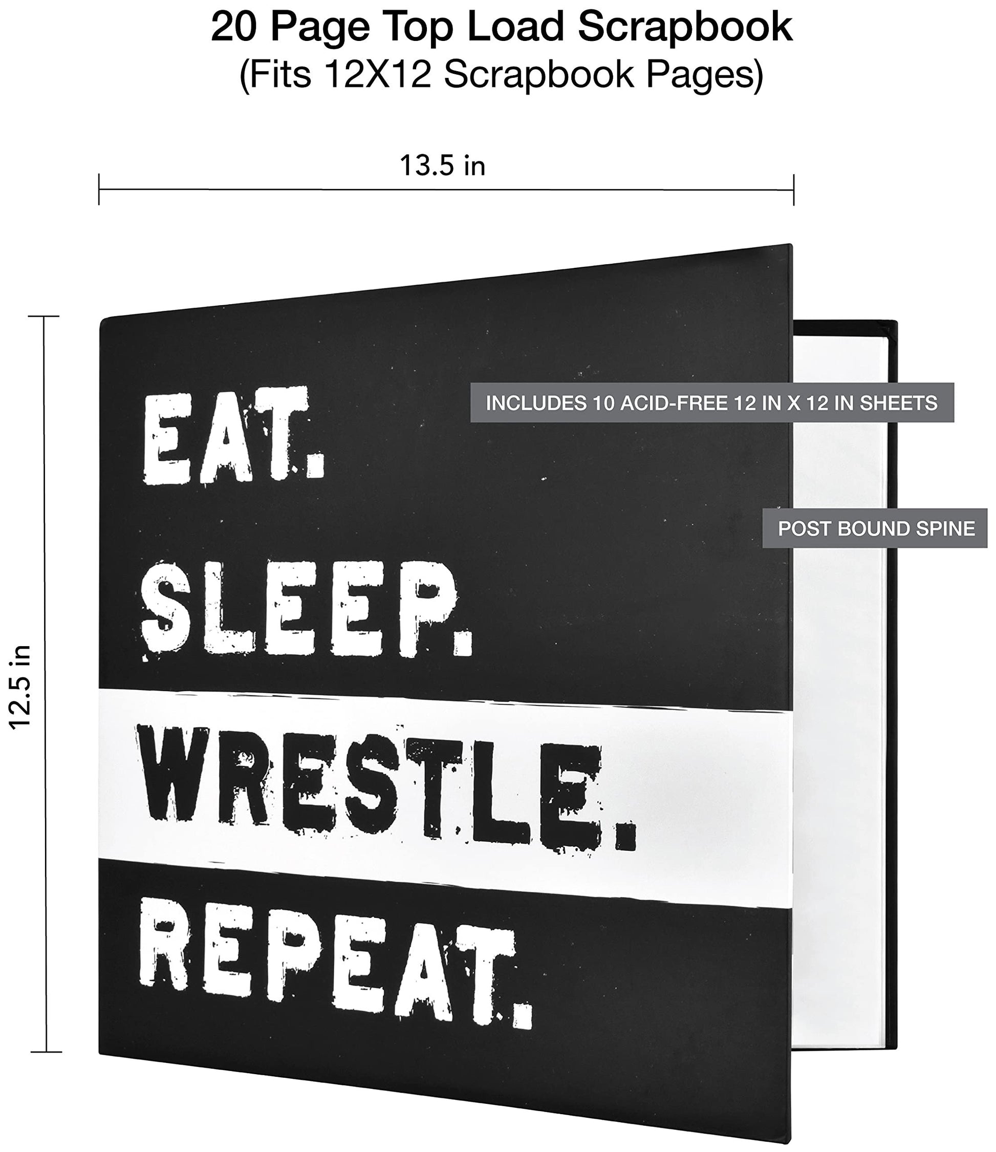 - Wrestle Memory Book: With its black "Eat Sleep Wrestle Repeat" cover, this large scrapbook measures 13.5 x 12.5 inches overall and comes with a clear dust jacket to keep your memories secure for years to come