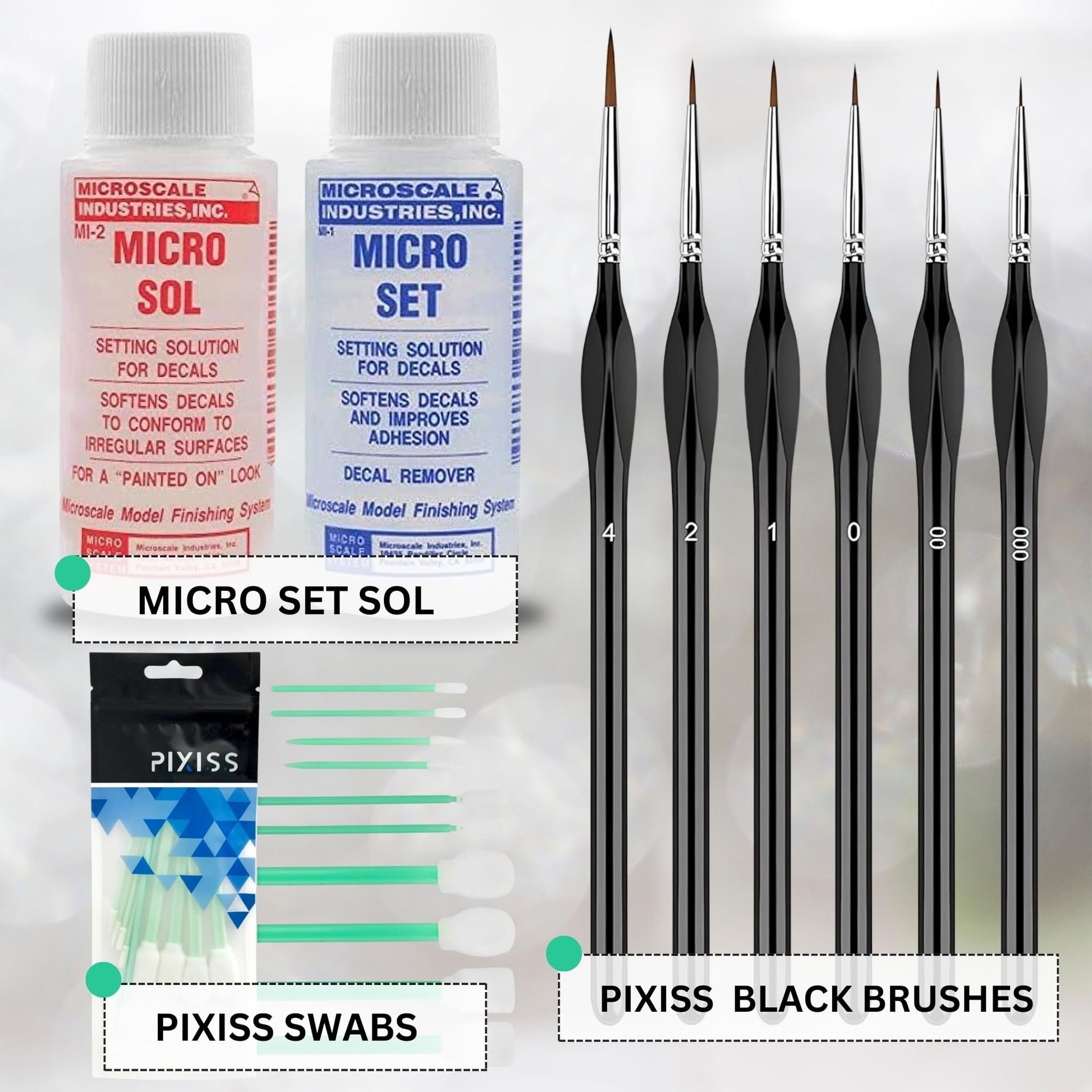 - All-in-One Solution for Perfect Decals: With both Micro Sol and Micro Set, along with high-quality Pixiss brushes and swabs, this kit has everything you need for decal application, from start to finish.