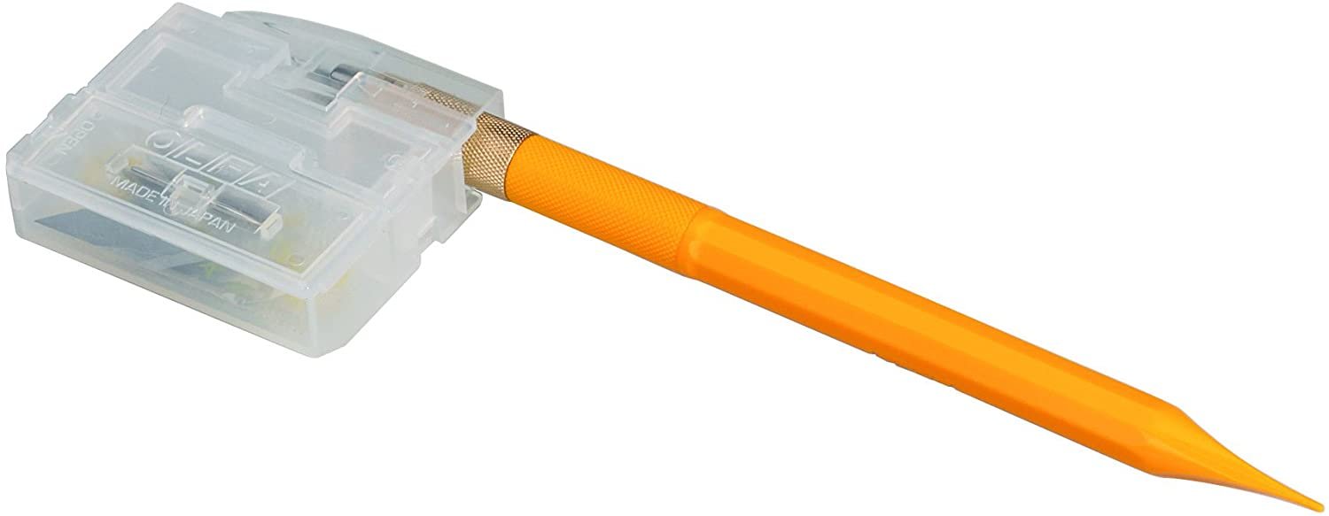 About the OLFA Designer Graphic Art Knife Set (AK-5): Our craft knife set has 30 KB-5 Art Blades made from high quality carbon tool steel for unparalleled sharpness and superior edge retention. It also includes an art needle that's perfect for piercing projects. The pen-like hobby knife has a textured, contoured handle that delivers comfort and stability during use. You'll be able to work longer as these features help reduce hand fatigue. Designed for both right and left-hand use. You'll be back to creating beautiful arts and craft projects in no time with the simple quick-spin blade change. It allows you to quickly and easily replace dull blades by turning the safety locking system. The art knife provides accurate and reliable performance for delicate cutting of paper, vinyl, rubber, models, cardstock, foam, and more. The tapered base of the handle allows for embossing, scoring, and accurate folds. About OLFA: Ever since Yoshio Okada, the founder of OLFA CORPORATION, invented the world's first snap-off blade cutter in 1956, OLFA has been committed to developing practical and safe hand-held cutting tools.OLFA brand blades are made with top quality materials, forged with technologies that stem from traditional sword-making, sharpened with technologies that give a blade life, and ultimately finished with the craftsmanship that brings all of this together. The holders and handles that allow users to gain the full cutting performance of these high-quality blades are designed, developed, and manufactured in Japan and subjected to stringent quality checks throughout the process.OLFA is proud of the unwavering quality that goes into every product it makes.