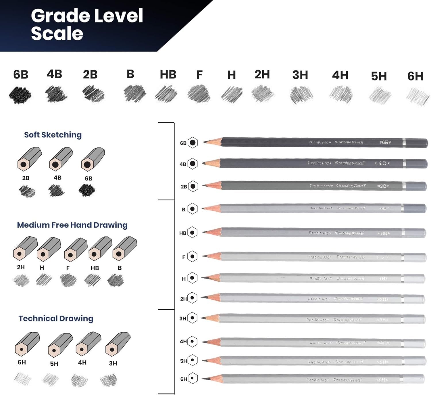 - PREMIUM GRAPHITE PENCILS - Whether you are learning a new drawing skill or creating masterful fine art, Pacific Arc's sketching pencils for artists will yield you the best results. The 12 grades of graphite lead (6b,4b,2b,b,hb,f,h,2h,3h,4h,5h,6h) will ensure you have the right art pencils for drawing and shading any project.