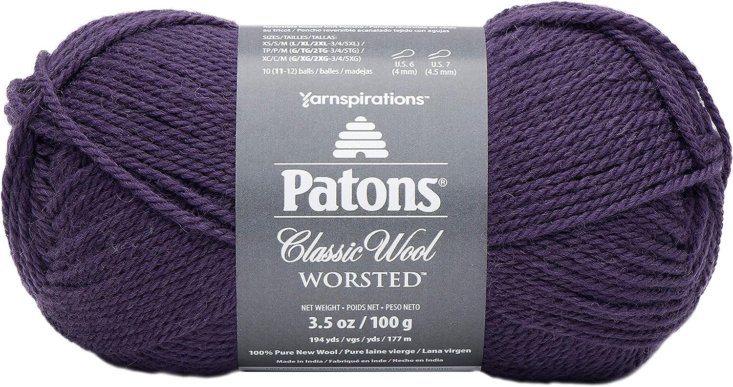 PATONS-Classic Wool. Patons Classic Wool Worsted really is a classic yarn. This 100% wool yarn is worsted weight, making it incredibly versatile for so many different projects! Try Class Wool Worsted out when you start your next sweater or blanket pattern and we think you'll fall in love. Available in a wide shade range that covers everything from neutrals to neons, any knit or crochet project made in this yarn will be an heirloom! Keep your warm, woolly projects looking beautiful by handwashing them and laying them flat to dry, so everyhing you make can last a lifetime. Weight category: 4. Content: 100% wool. Putup: 3.5oz/100g, 194yd/177m. Gauge: 20sx26r = 4in/10cm on size US7/4.5mm knitting needles. Suggested crochet hook: USH8/5mm. Dyelotted: we try but are not always able to match dyelots. Care: hand wash, dry flat. Comes in a variety of colors. Each sold separately. Imported.