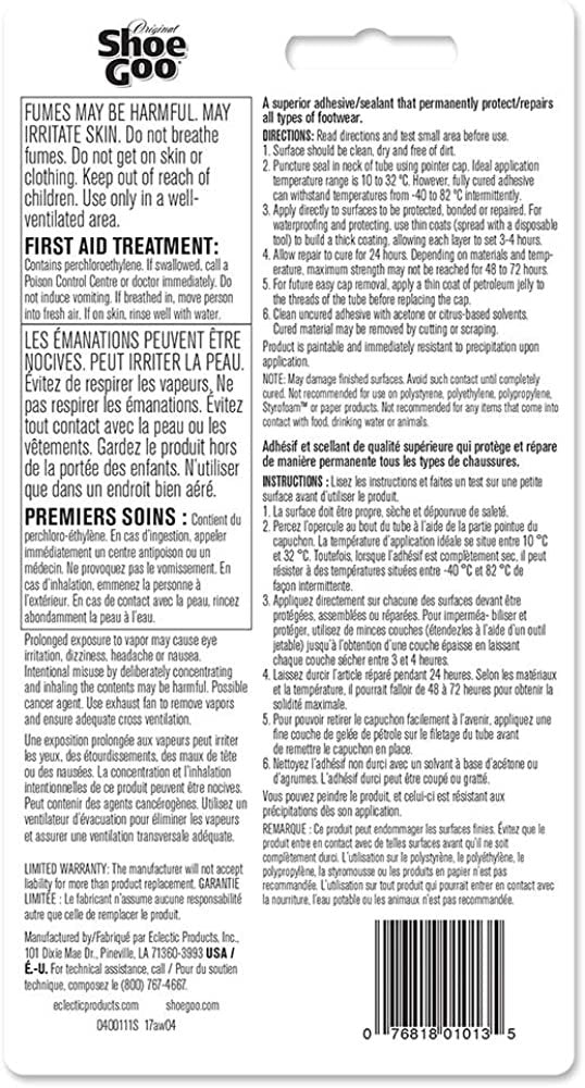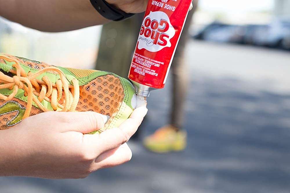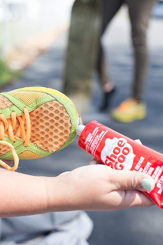 Shoo Goo repairs rubber soles, tears in canvases, lather tops or to stop shoe laces from fraying. Made of flexible rubber so wont crack under strain.