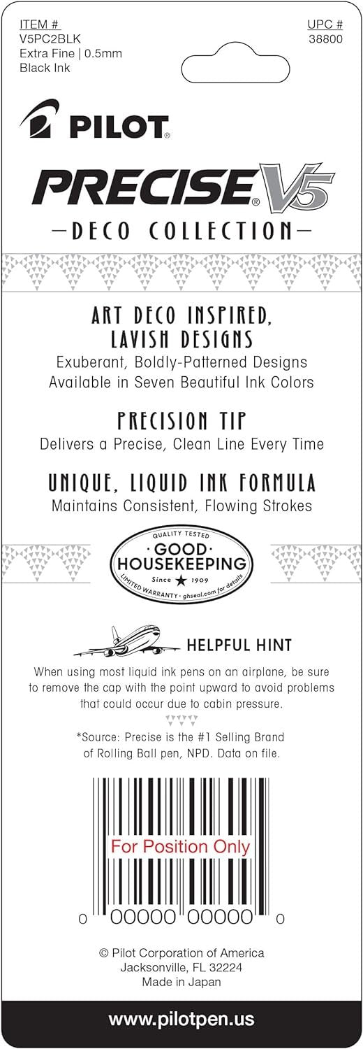 Pilot's Precise V5 Deco Collection brings bold design to the barrel of the classic smooth-writing Pilot Precise V5 rollerball pen. Always a favorite for it's consistent, flowing strokes and precise clean lines, the Precise looks better than ever. Pen is capped with pocket clip on cap. Extra fine point.