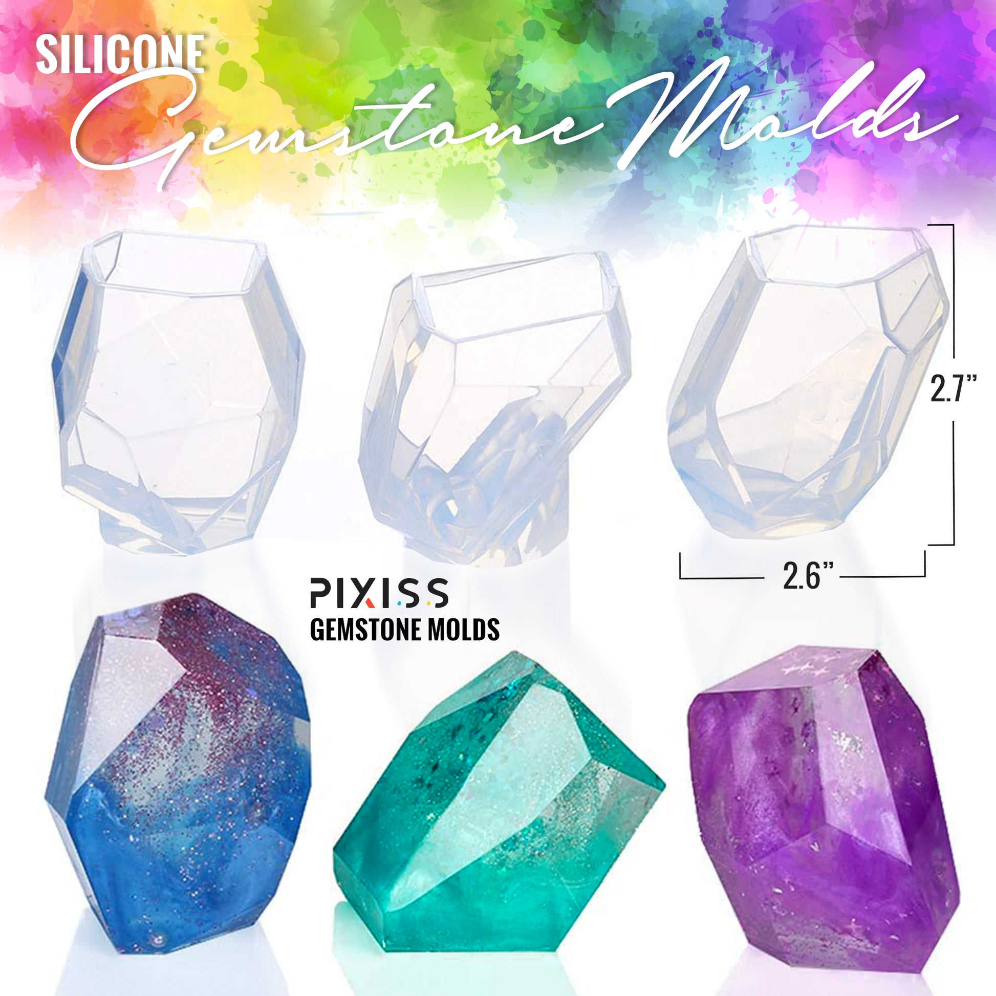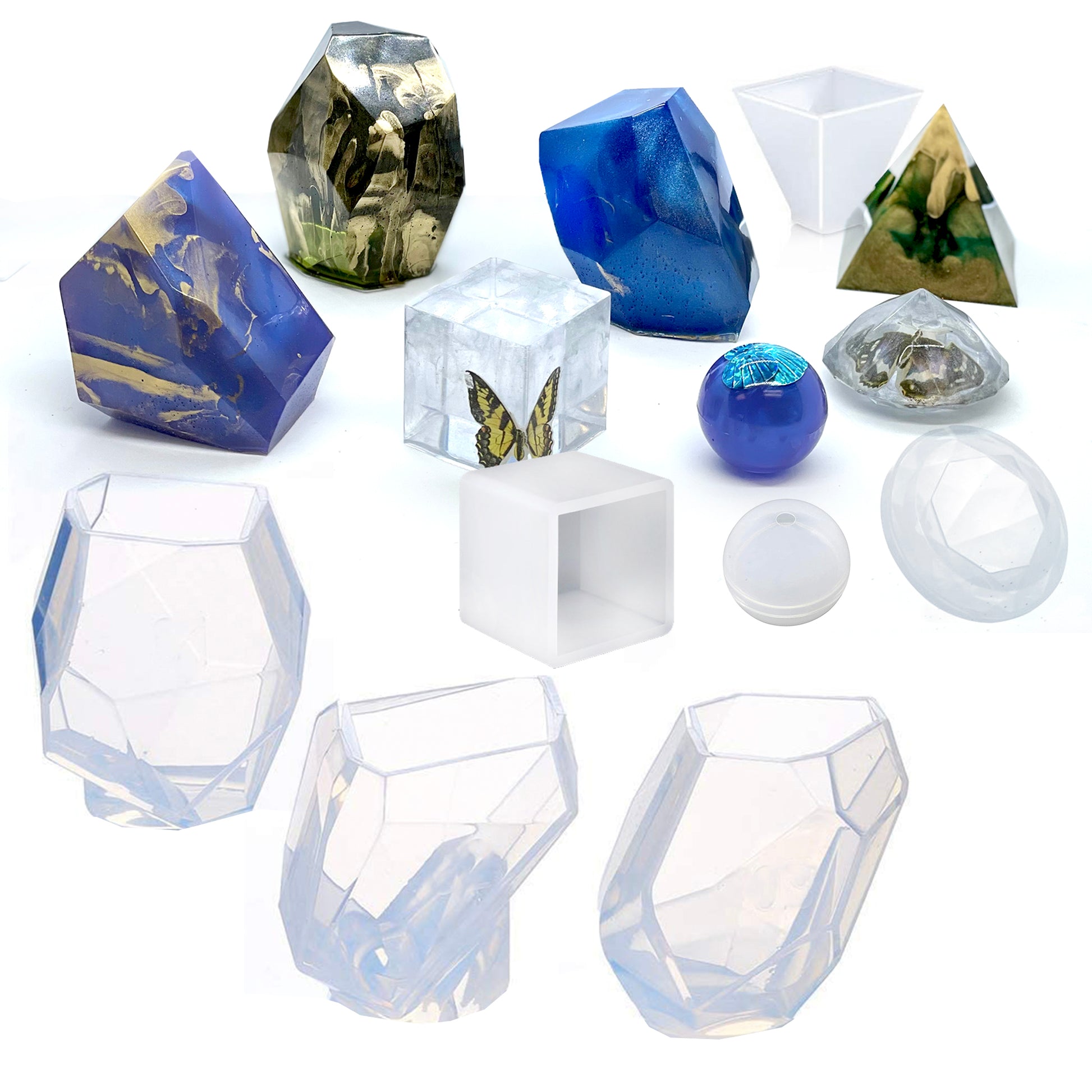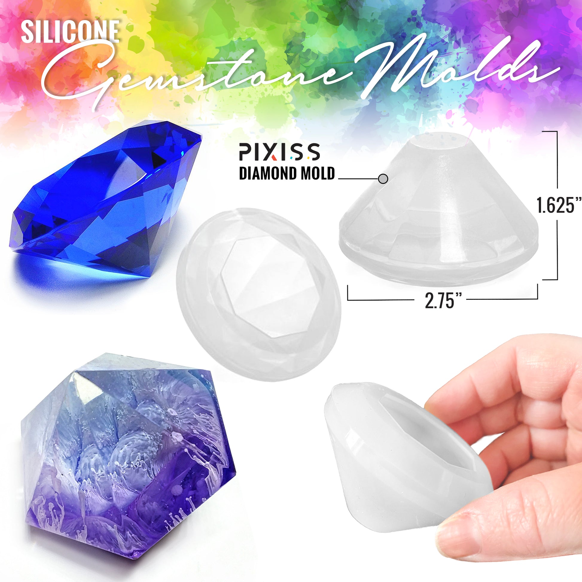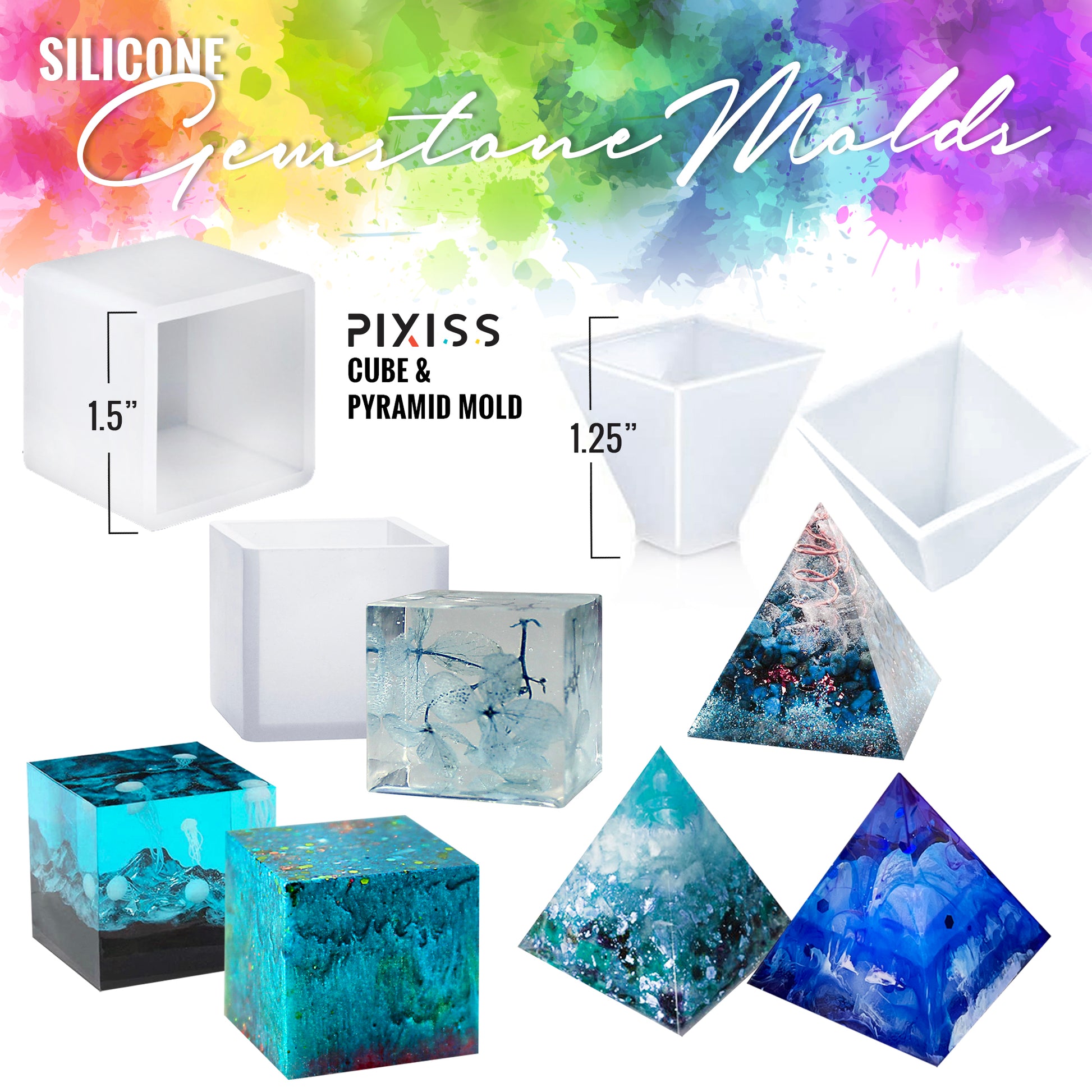 PIXISS Silicone Gemstone Mold Kit. 3 large silicone gemstone-shaped molds. 1 silicone pyramid mold. 1 silicone sphere mold. 1 silicone diamond mold, and 1 silicone cube mold.