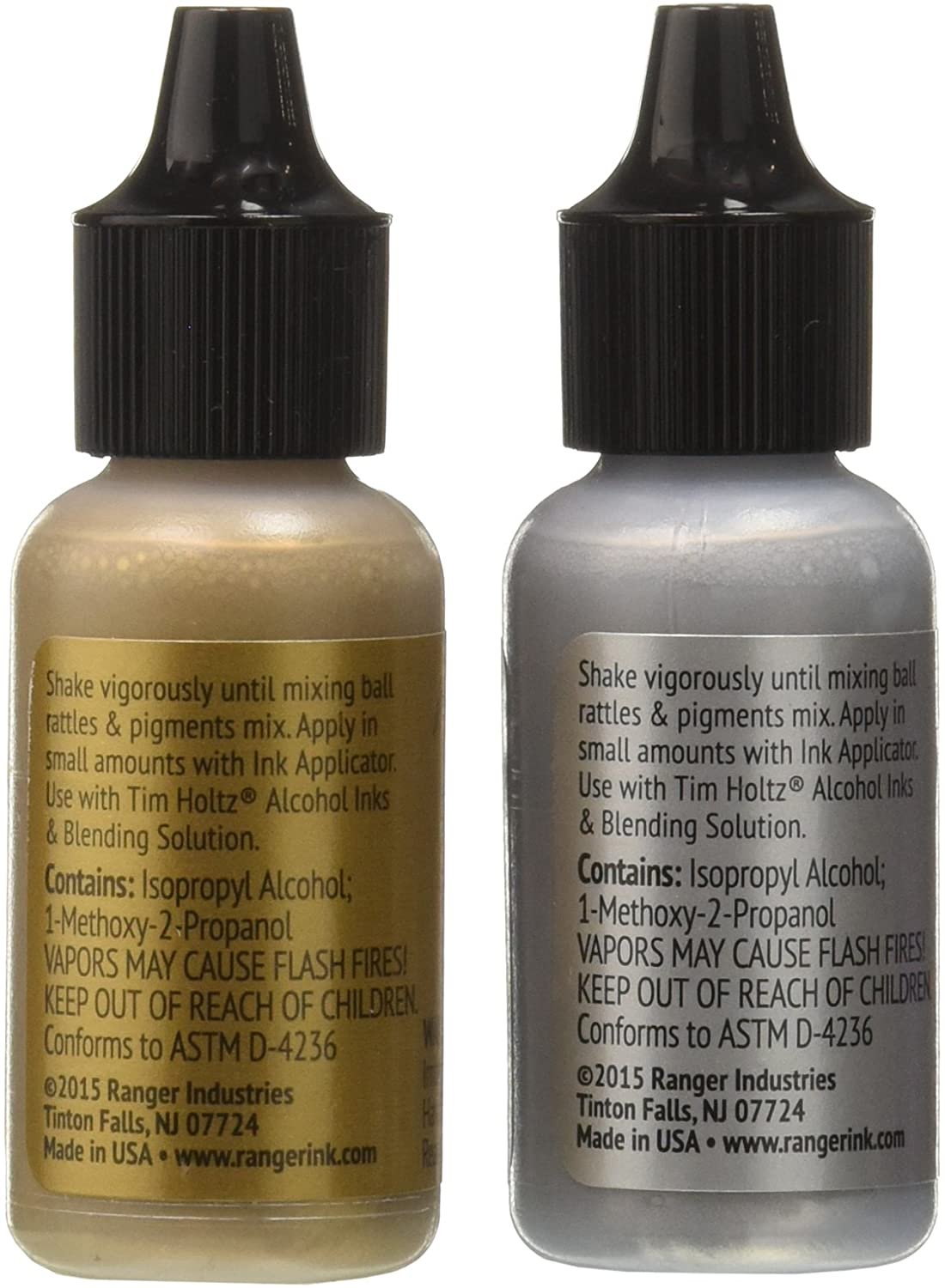 TIM HOLTZ-(2) 1/2 fluid ounces of metallic luminous multi-surface inks. Includes gold and silver. Acid free quick drying and versatile. Specially formulated to create luminous highlights when combined with Adirondack alcohol inks. Use them on light or dark gloss paper memory glass dominoes metal foil shrink plastic and other non-porous surfaces. Conforms to ASTM D 4236. Use with alcohol inks for polished effects.