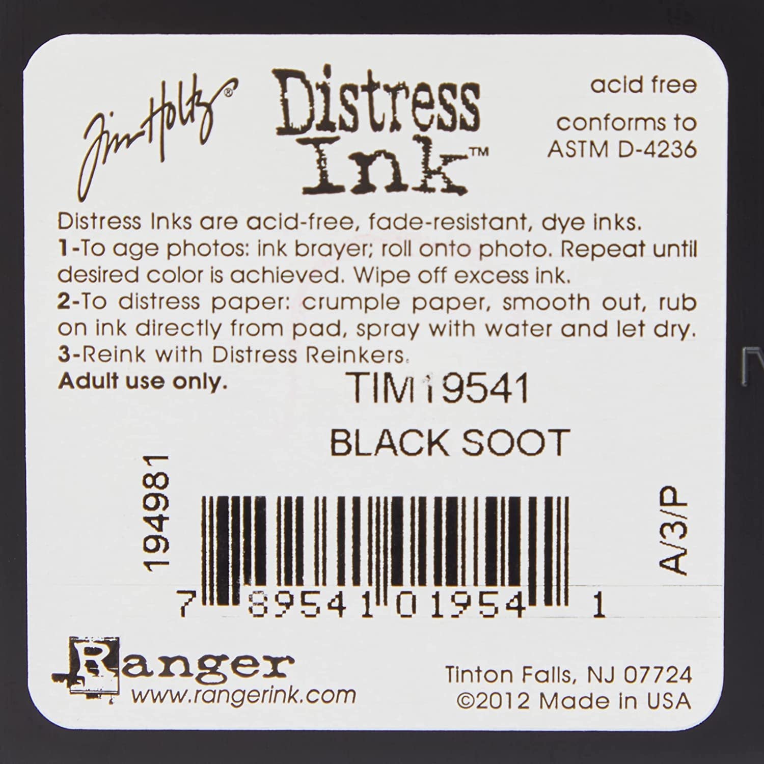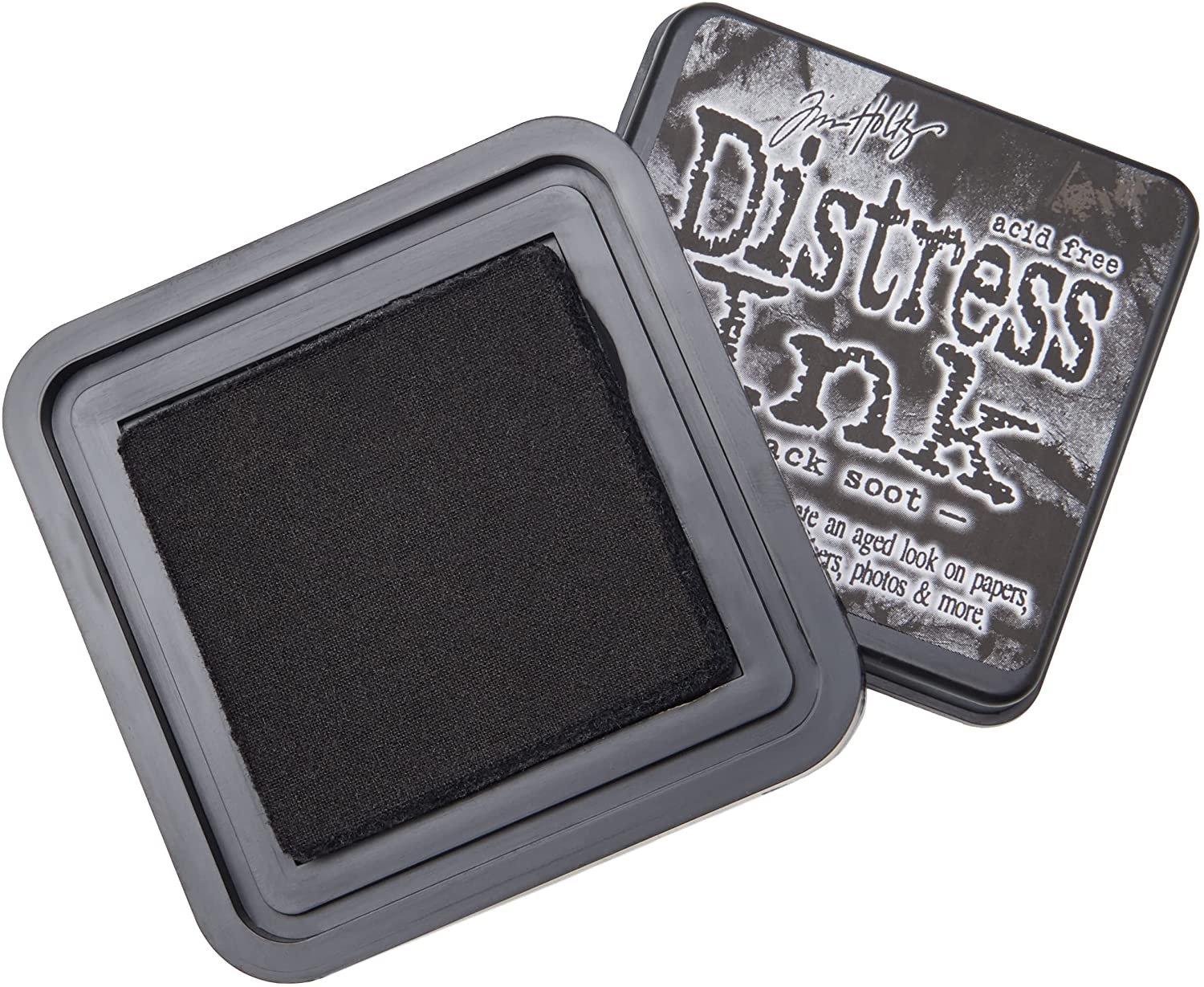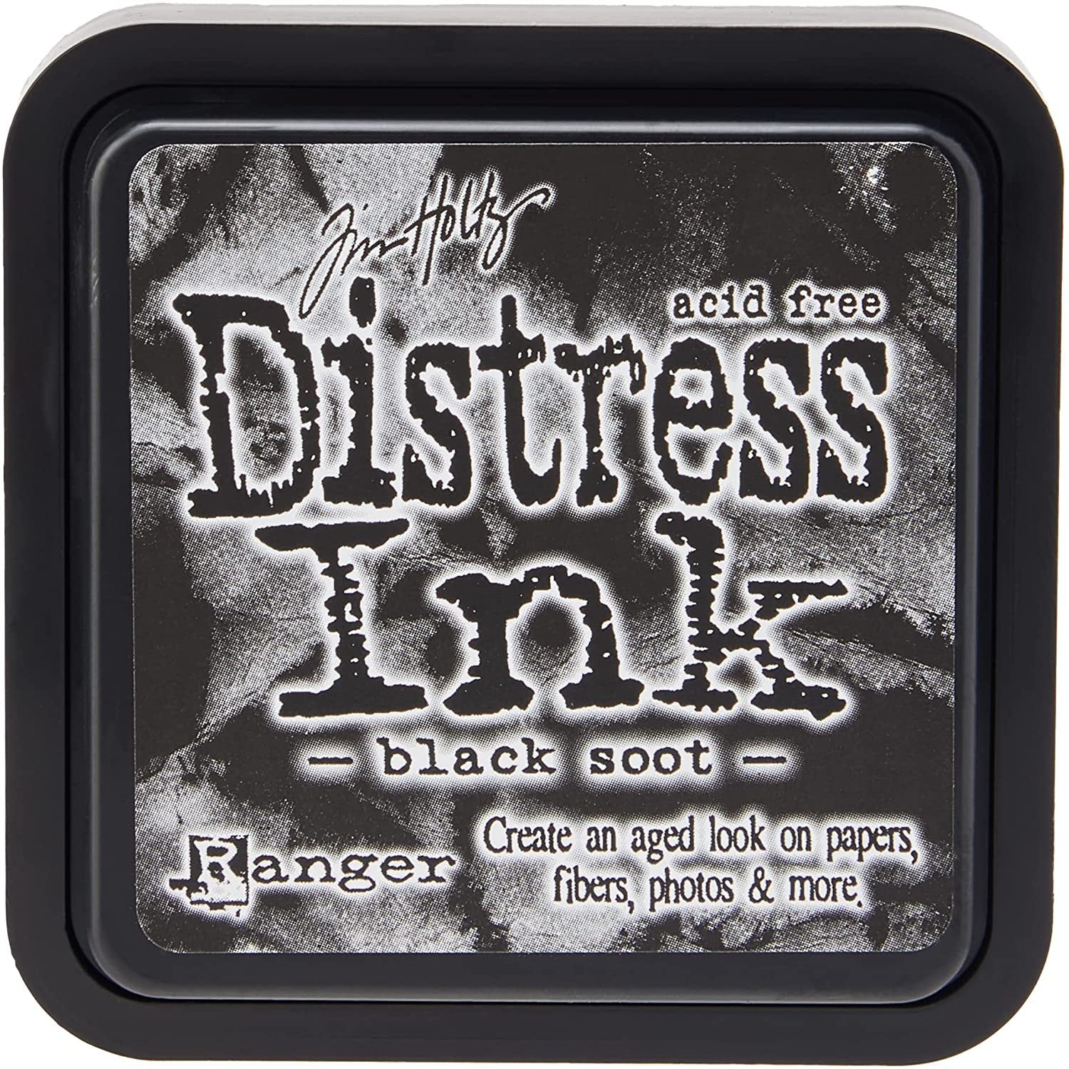 Ranger Tim Holtz distress ink pads are raised ink pads with acid free, non-toxic, fade resistant, water-based dye inks. They're perfect for new vintage, stained, and aged effects for crafters who are creating their Altered books, on scrapbook pages, cards and paper crafts projects. These colors produce a realistic, weathered look on paper, photos, decorative fibers and so much more. Ink pads are 2 inch square, and are stackable. Black soot - similar to black.