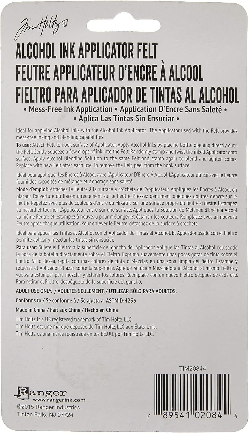 Use these pre-cut felt pads with the Adirondack Alcohol Ink Applicator (not included) for mess-free inking and blending. This package contains Tim Holtz Adirondack Alcohol Ink Applicator Felt, 50 replacement felts. Imported.
