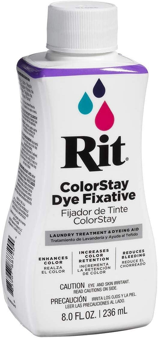 Rit dye fixative is an easy-to-use solution designed to lock in color, keeping your fabrics looking their best and brightest for the long run. It reduces bleeding, fading and even enhances the color of your project. Use after dyeing to lock in color. Or use it immediately after a tie-dye or dip-dye project to prevent dye from bleeding into white areas. It is even effective on commercially dyed fabrics. Whatever your purpose, ColorStay Dye Fixative assures you will get lasting color for the long run.