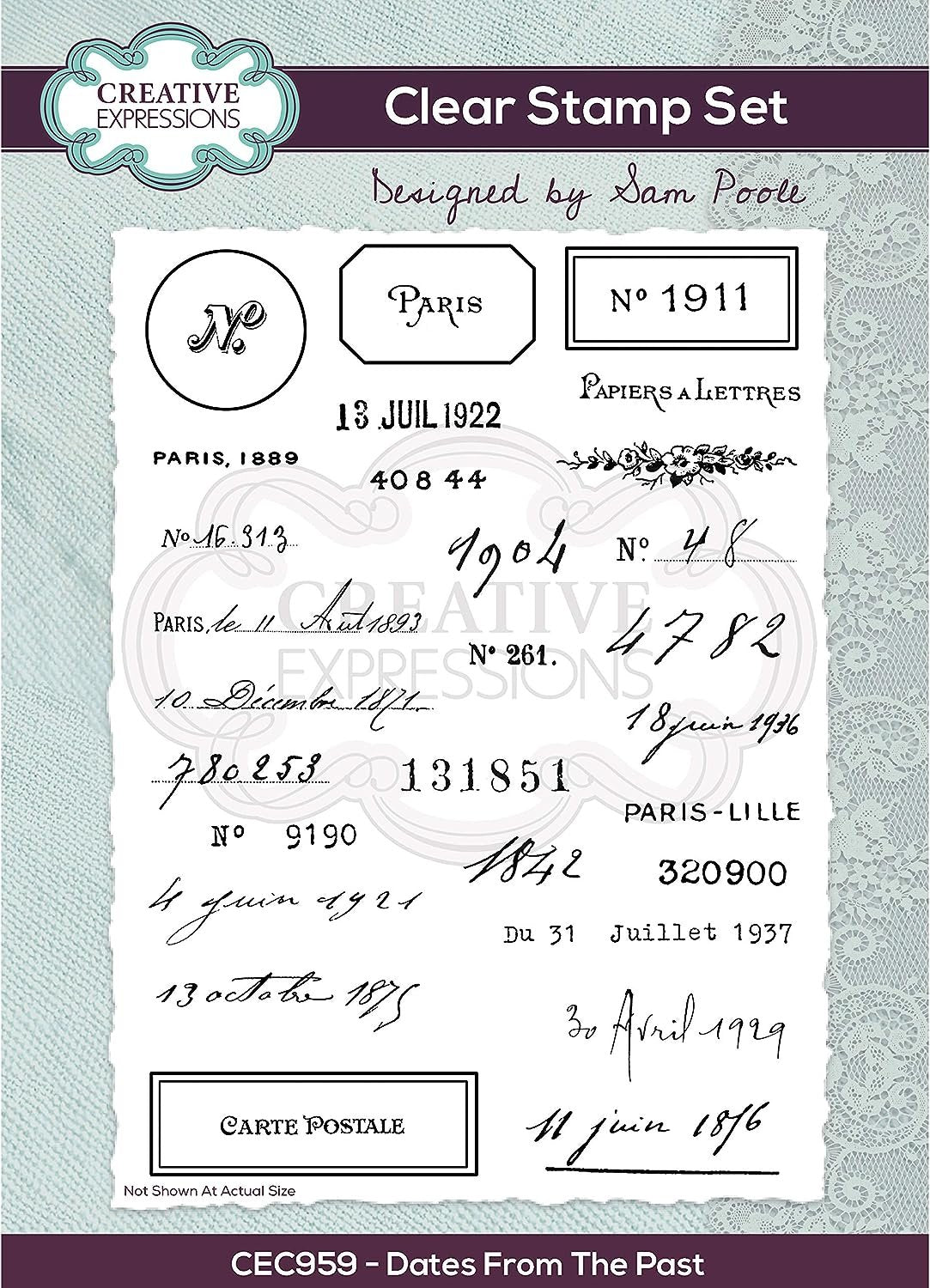 Creative Expressions Sam Poole Dates From The Past A5 Clear Stamp Set Bumper set of thirty-four stamps from this innovative designer. This date-based set is great for cards, scrapbook pages, mixed media and so much more. This clear stamp set is ideal for adding a touch of something exotic to any project. Ready to mount on an acrylic block the stamps can be used with ink pads, paint, or used with pigment and embossing powder. They are suitable for paper, fabric, or any other surface depending on the ink choice. High quality Polymer stamps designed and made in the UK. Why not check out the Creative Expressions YouTube Chanel for ideas? Designed and made in the UK. Set size A5. Great mix of images, labels and words Dates of various styles for mixed media projects A5 size set with 34 stamps