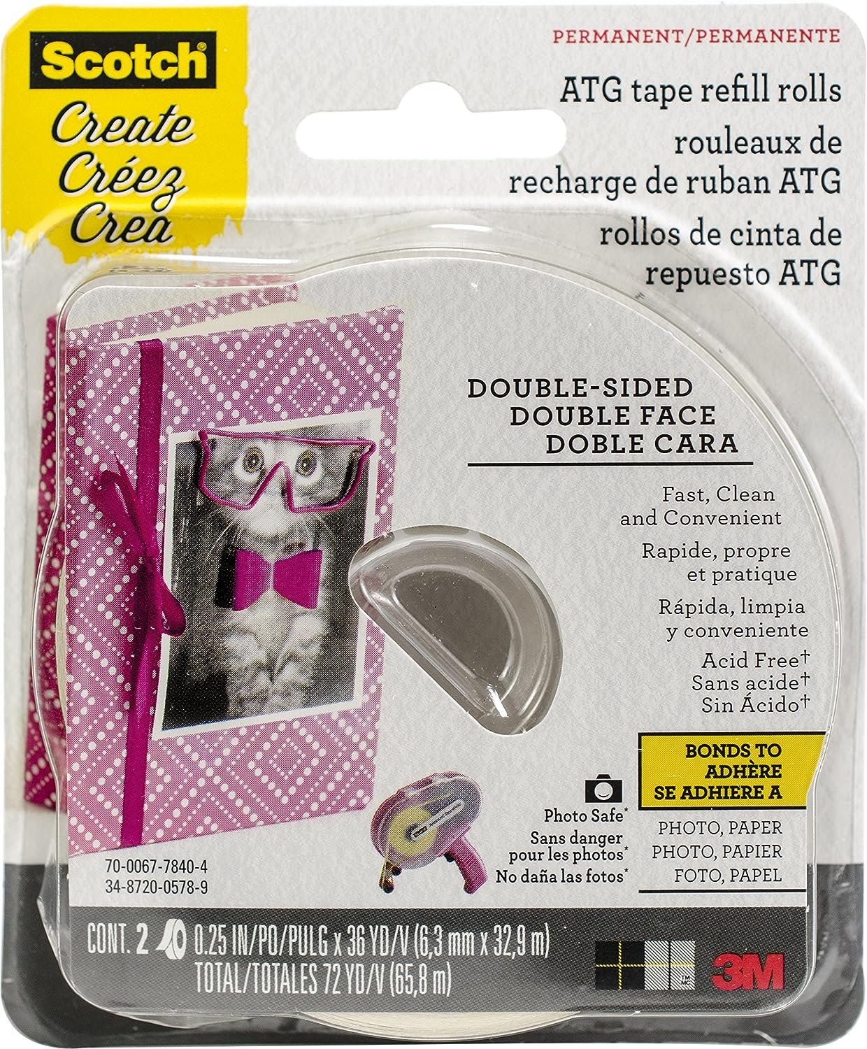 This package contains two 1/4in by 36yd rolls of permanent, acid-free tape. Great for scrapbooking, card making, invitations and other paper crafts. Photo Safe. For use with the Pink Advanced Tape Glider dispenser only (sold separately). Made in USA.