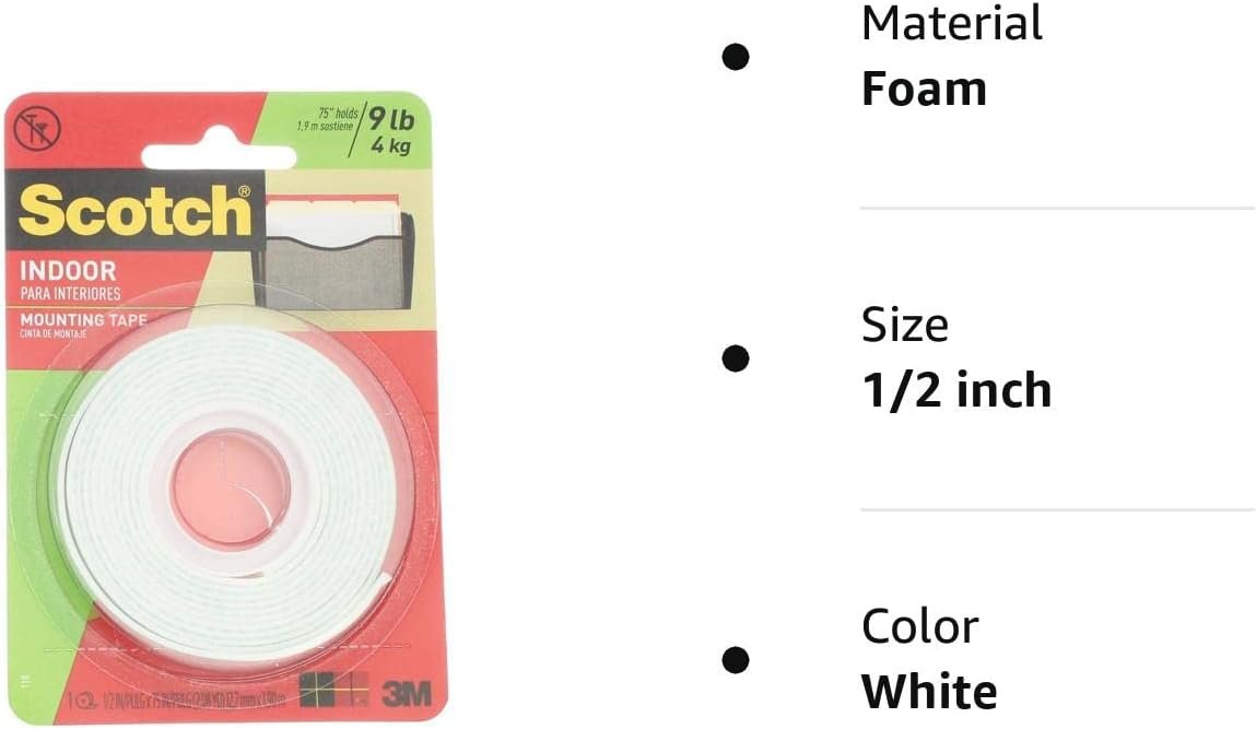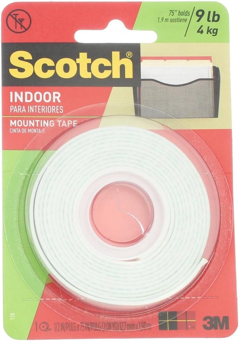 Scotch Indoor Mounting Tape 110/DC. A double-coated foam tape that adheres and conforms to a variety of surfaces. Faster, safer, and more versatile than screws or nails, this general purpose mounting tape is designed for attaching items up to five pounds to virtually any smooth wall or surface.
