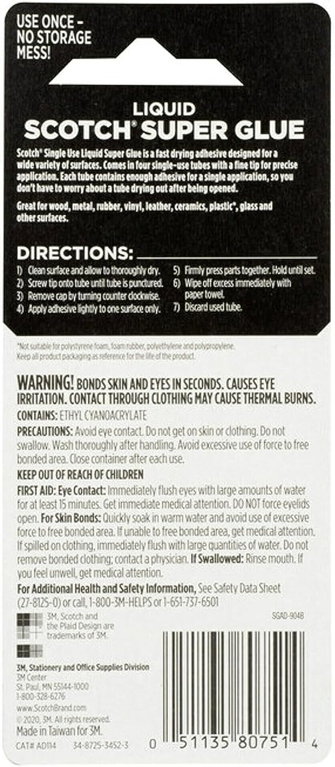Scotch Single Use Super Glue Liquid is a fast drying, strong adhesive designed for a wide variety of porous and non porous surfaces. Excellent for wood, metal, rubber, vinyl, leather, ceramics, some plastics, and other surfaces. Comes in four single use tubes with a fine tip for precise application. Each tube contains enough adhesive for a single application, so you do not have to worry about a tube drying out after being opened.