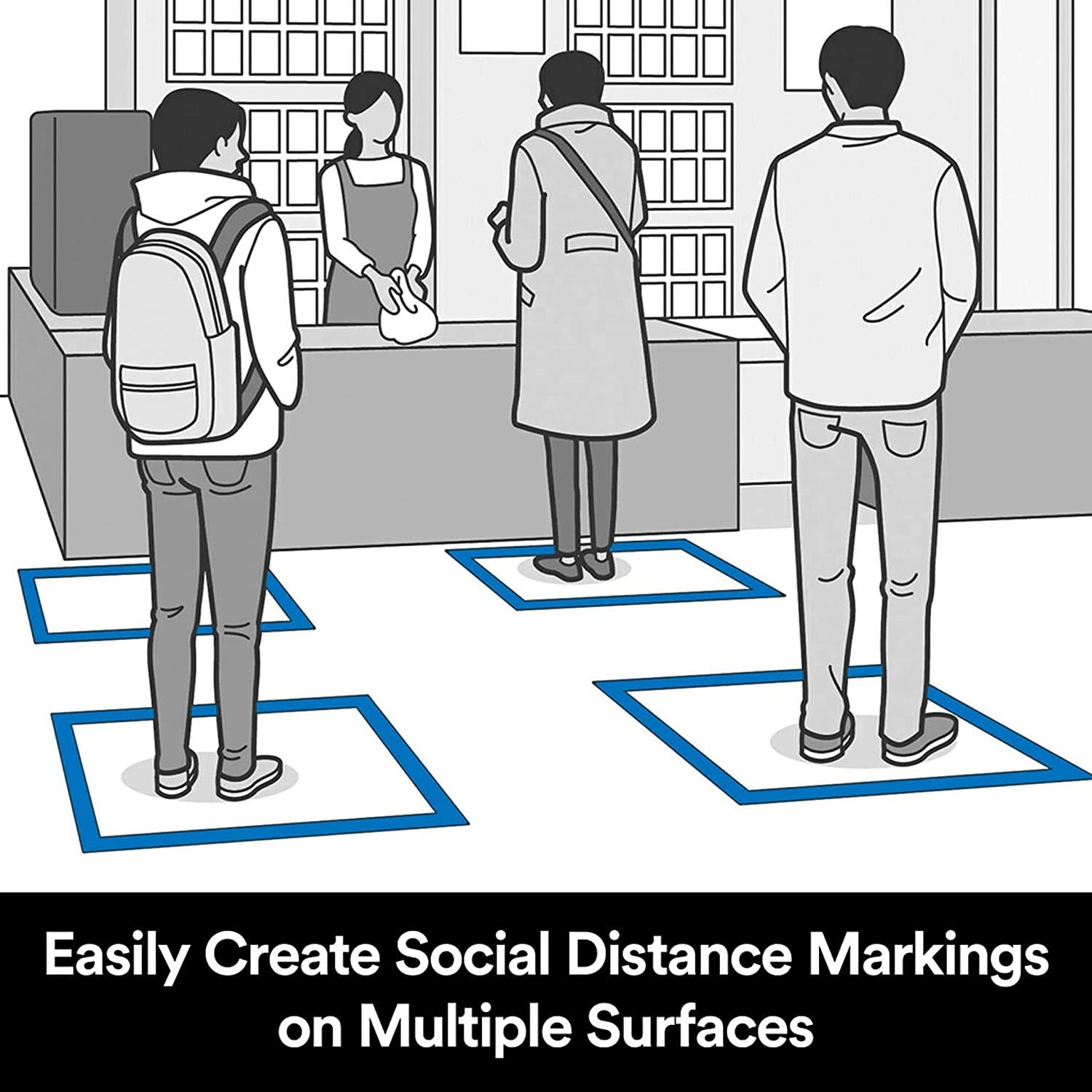 - CREATE SOCIAL DISTANCING MARKINGS: Create box or “X” queues for waiting areas or make lanes in aisles in a fast, easy, and efficient way – whether it’s short- or long-term use