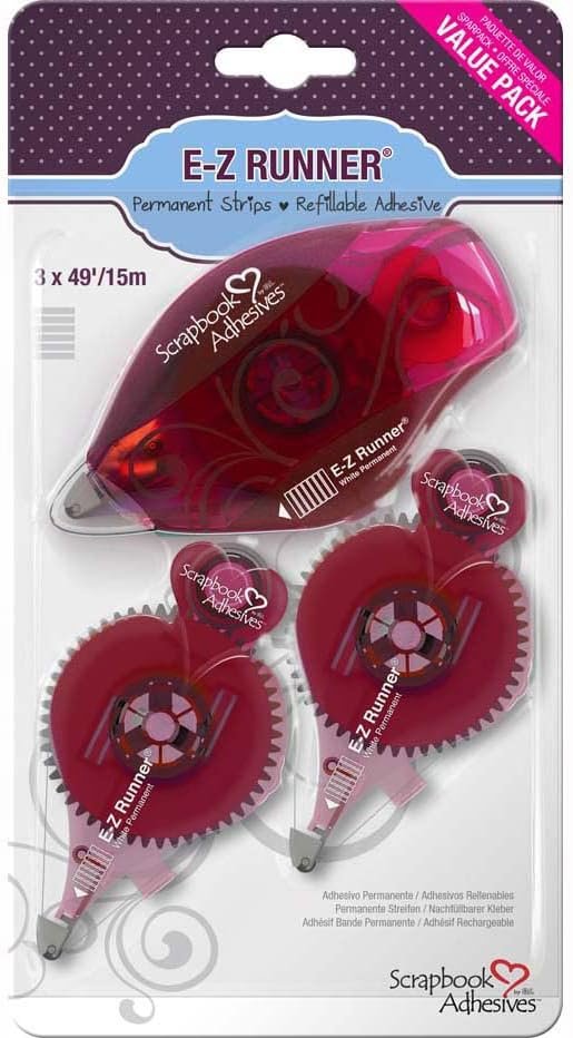 Designed to make your creativity last! These strong, permanent, double-sided adhesives. Are perfect for papercrafting, scrapbooking, cards and more. Strips allow application in curves, circles and small spaces. You can mix and match with any E-Z Runner, even in mid-use. Easy to use and refill. This 5x9 inch package contains one dispenser and two refills (147 feet total). Acid free and archival safe. Imported.