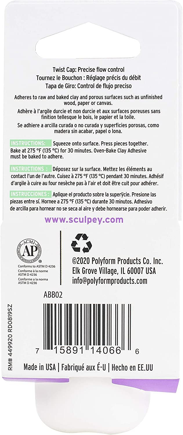 Sculpey Oven Bake Clay Adhesive, Non Toxic, 2 fl oz. bottle with precise flow twist cap. Great for gluing polymer clay to itself and porous surfaces.
