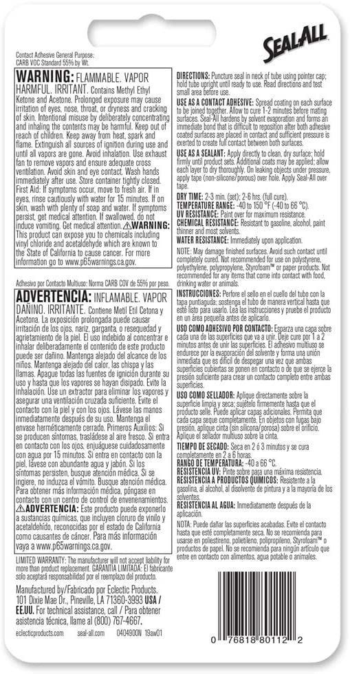 Eclectic Products Inc. is a retail line of adhesives which replaces glue, paste, rubber and contact cement and silicone. Made with the highest quality and durability this line of products will be sure to tackle any job. 2-Ounce. Seal All, All Purpose Adhesive. Acts as a glue and sealant. This is a fast drying and clear formula. Not affected by gasoline, oil, alcohol, water and most solvents. Water resistant immediately upon application. Paint over for UV-resistance. Sets in 2-3 minutes. Ideal for automotive and garage repairs.