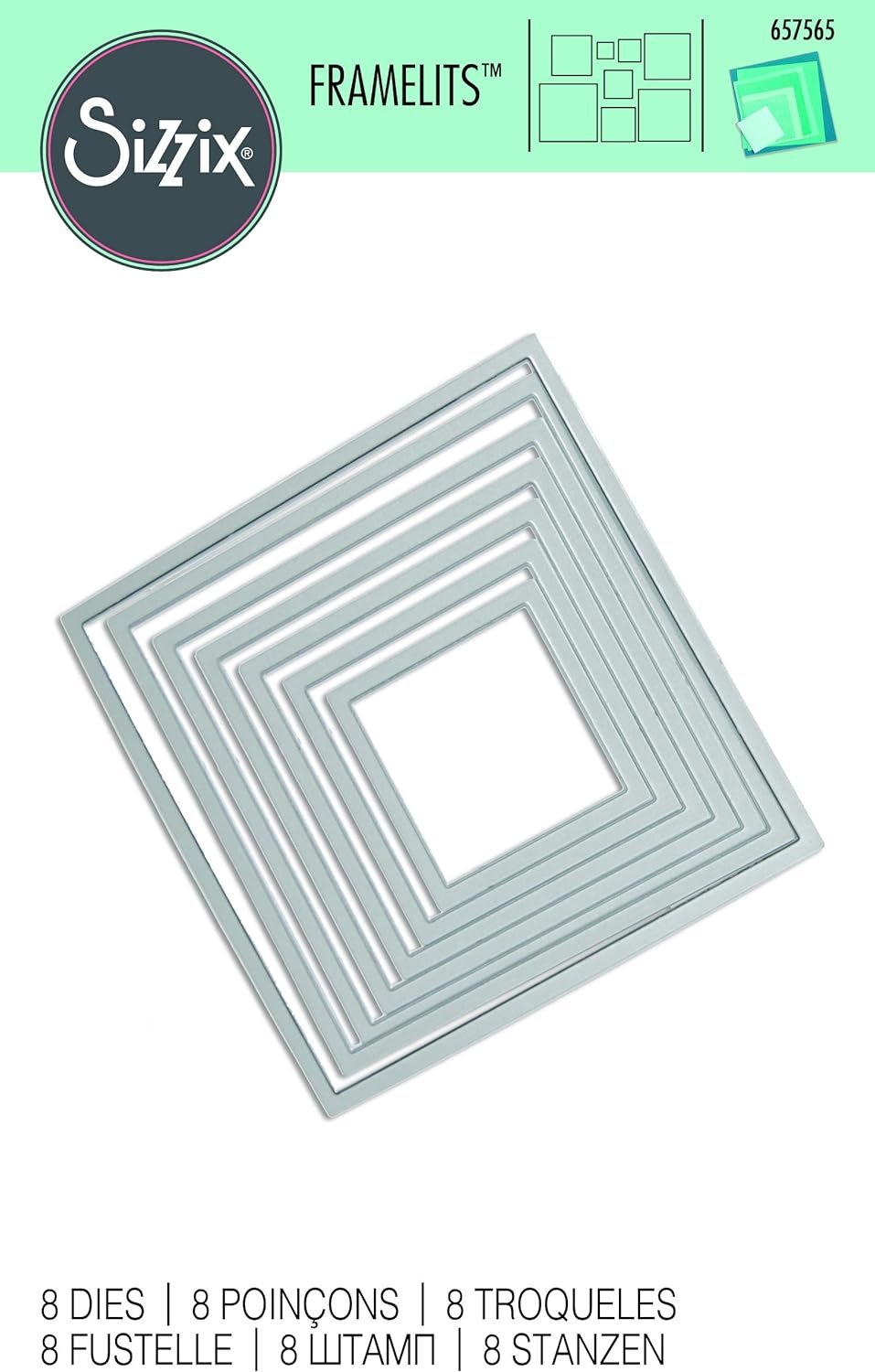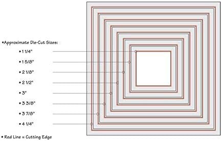 Cut what you see. It's that easy and efficient with Framelits. These wafer-thin chemical-etched die sets feature the perfect print registration without interference from any ridges at the edge of the die opening. Plus, they're excellent for clearly cropping photos and cutting windows in cards, bags, boxes and scrapbook pages. Designed to cut a single sheet of cardstock, paper, metallic foil or vellum, these dies also make great stencil sand are perfect for layering to produce a 3-D effect. Works with Sizzix BigKick, Big Shot and Vagabond machines (not included). This package contains Squares: eight dies measuring 1-1/2 up to 4-5/8 inches. Die cut measures 1/4 up to 4-1/4 inches. Imported.