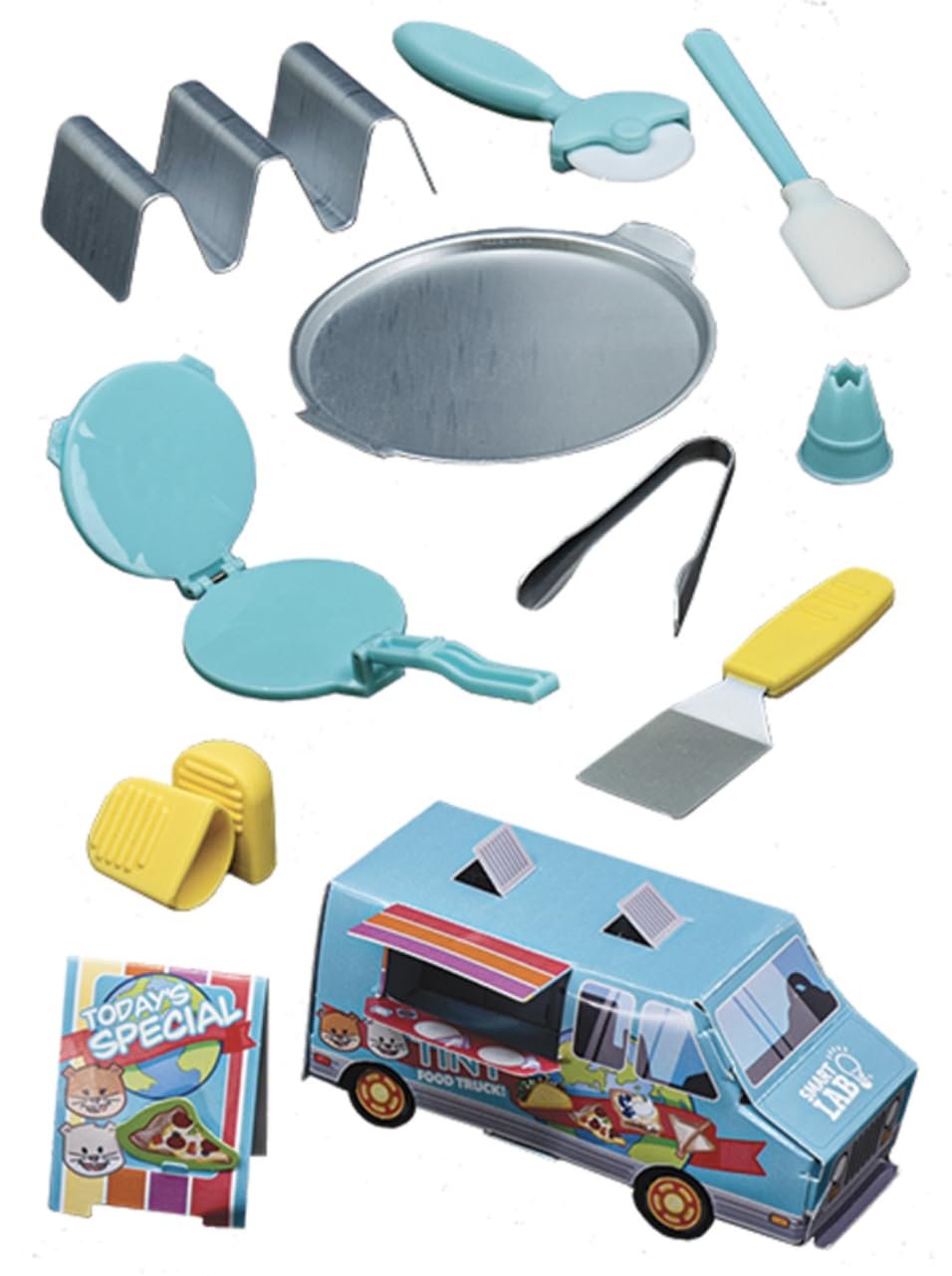 From SmartLab Toys! Use real kitchen tools to whip up itty-bitty tacos, churros, pizzas, crepes, and more! Discover how protein and heat work together to make eggs hard, cheese soft, and pizza crust brown! Assemble and display a tiny food truck and menu board! Includes: tortilla press, taco rack, pizza/crepe pan, pizza cutter, spatula, turner, tongs, piping tip, pastry bag, 2 silicone finger mitts, 10 food wraps, papercraft food truck and menu board, and illustrated fold-out recipe sheet with 20 recipes. Recipes require food ingredients not included in this kit. You can find a complete list of ingredients used in the recipes inside the book. Adult supervision and assistance are required for items baked in the oven and microwave.
