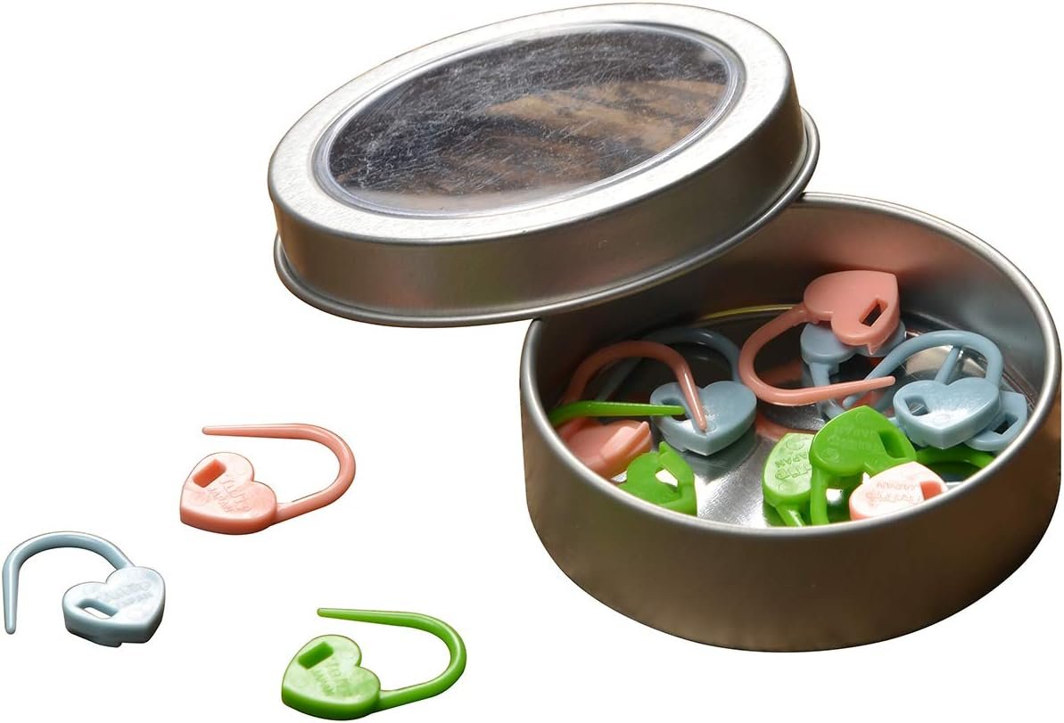 Tulip Needle Company-Stitch Marker Set: Heart. These round-nose locking stitch markers are specially designed to not split the yarn while you easily pick up stitches. This 2-1/2x2-1/2x3/4 inch package contains fifteen stitch markers in assorted colors and