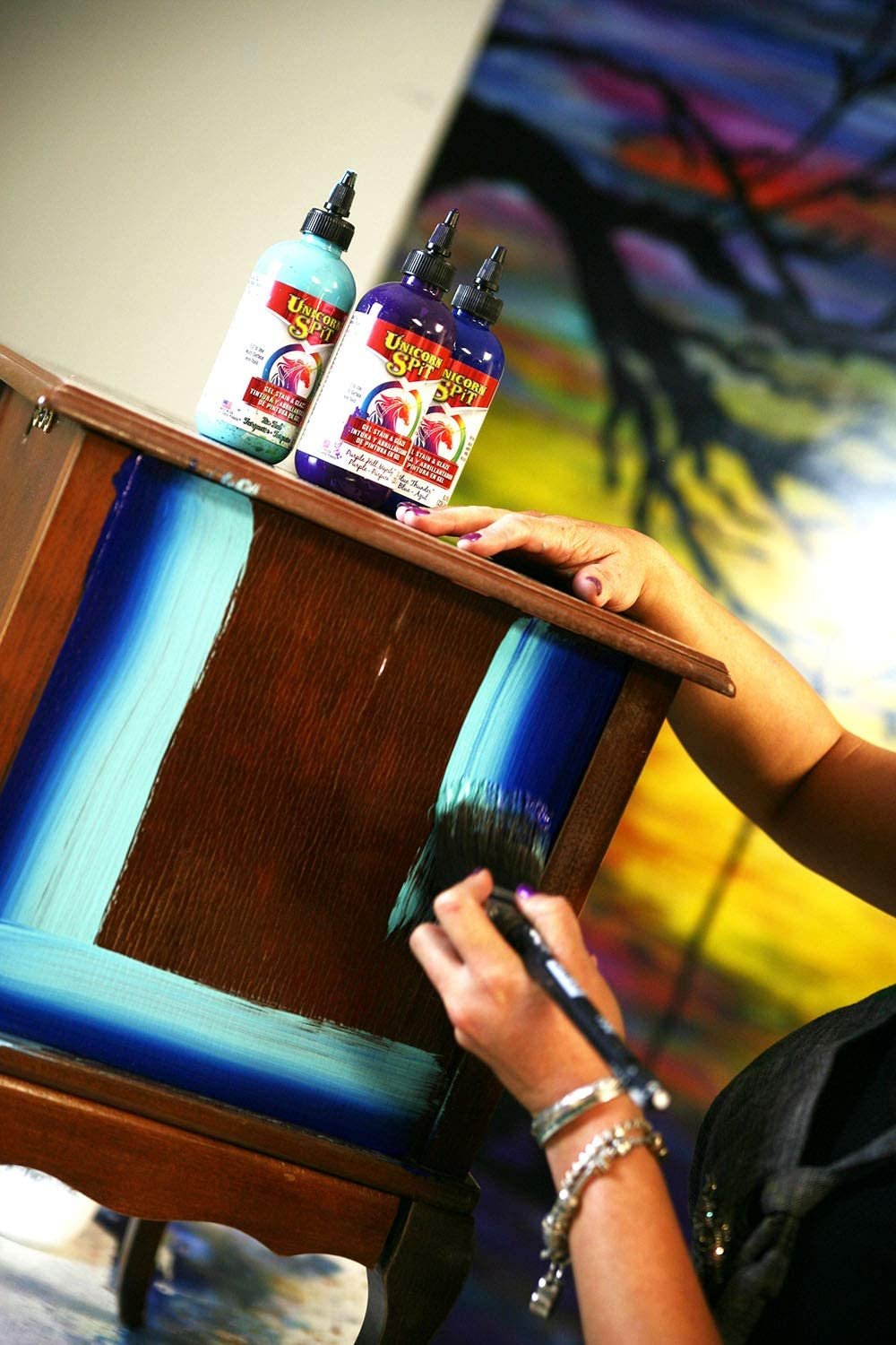 UNICORN Spit allows anyone to turn ordinary objects into personalized MASTERPIECES! Use on wood, glass, metal, fabric, pottery, wicker, concrete and laminate. Ideal for creating new - or - refinishing thousands of projects. Excellent for crafters, hobbyists, DIYers and pros alike! PAINT, GEL STAIN and GLAZE in One! Available in 6 vivid sparkling colors. Make your project as opaque or vibrant as your dreams require. Use as a paint or dilute with water to create a gel, glaze, stain, white wash or antiquing tint. Penetrates deep into bare wood grain or glazes over existing finishes, brightening and highlighting painted surfaces. Provides a 3-dimensional effect. Jasmine scented.