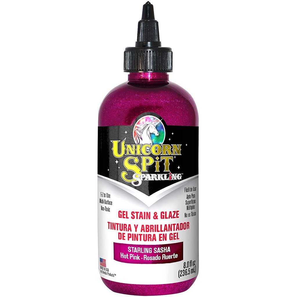 UNICORN Spit allows anyone to turn ordinary objects into personalized MASTERPIECES! Use on wood, glass, metal, fabric, pottery, wicker, concrete and laminate. Ideal for creating new - or - refinishing thousands of projects. Excellent for crafters, hobbyists, DIYers and pros alike! PAINT, GEL STAIN and GLAZE in One! Available in 6 vivid sparkling colors. Make your project as opaque or vibrant as your dreams require. Use as a paint or dilute with water to create a gel, glaze, stain, white wash or antiquing tint. Penetrates deep into bare wood grain or glazes over existing finishes, brightening and highlighting painted surfaces. Provides a 3-dimensional effect. Jasmine scented.