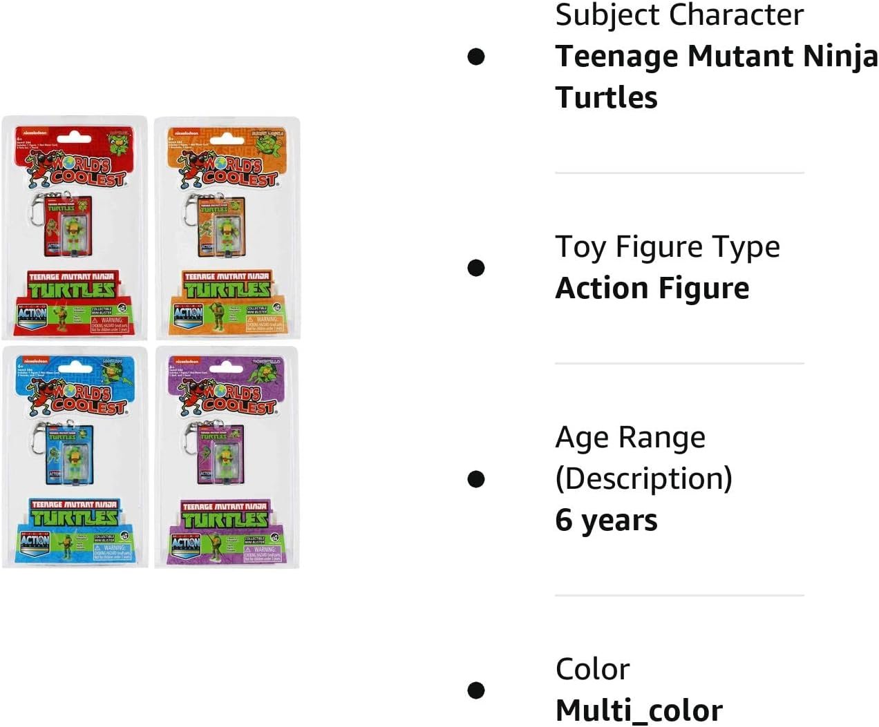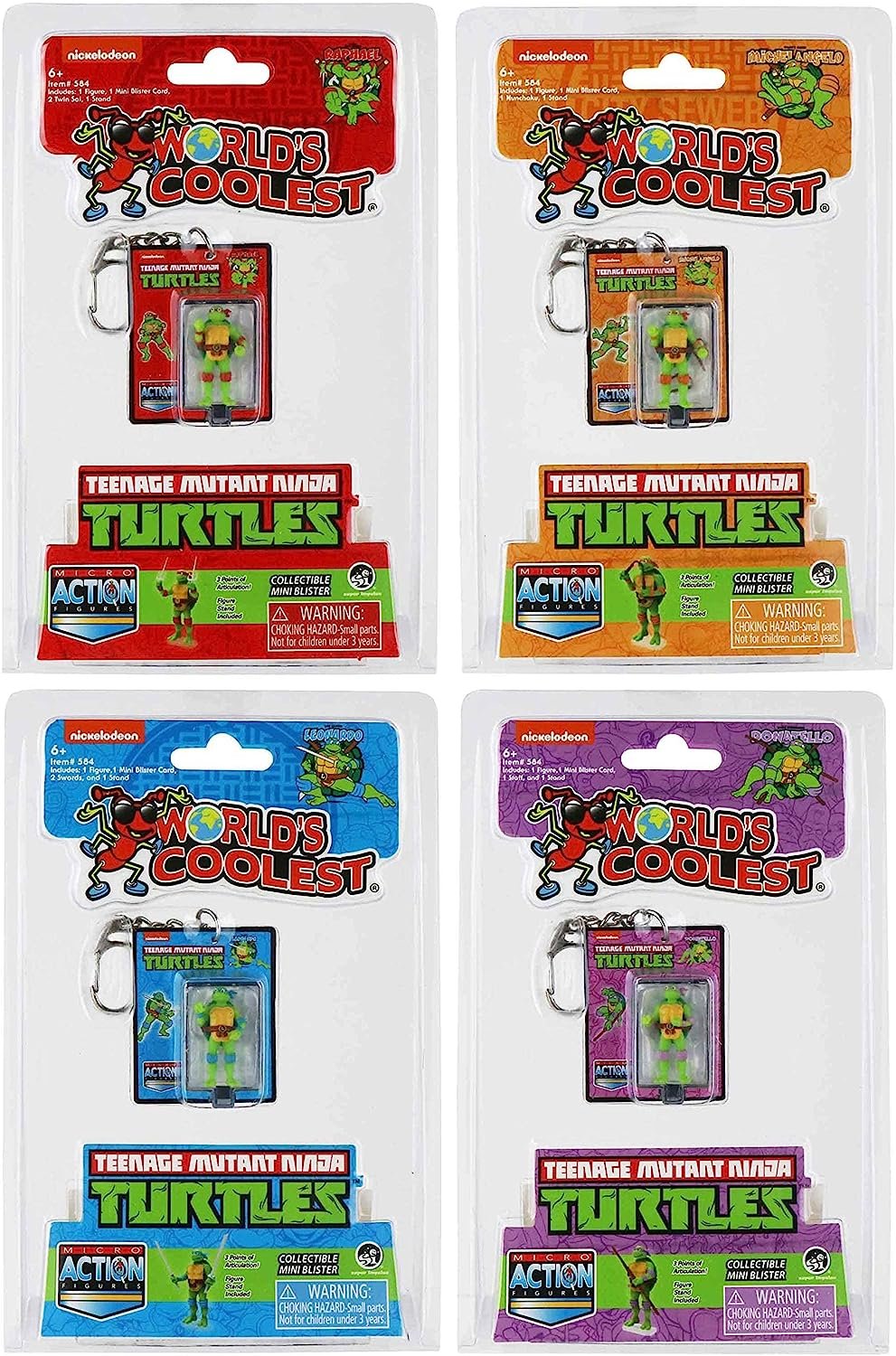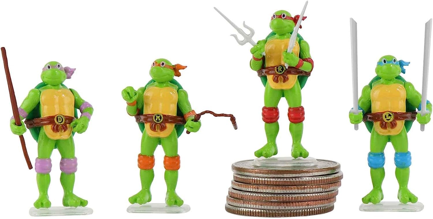 World's Smallest Teenage Mutant Ninja Turtles (Bundle of 4) Mutated from ooze and raised in the ways of Ninjutsu by their rat sensei, Splinter, the Teenage Mutant Ninja Turtles are ready to venture outside their sewer lair to fight evil everywhere! Now you and the Turtles can battle to save the city from evil in a micro size! Micro Action Figures is a line of highly detailed micro action figures for fans of all ages to collect and display. Now available in the world’s smallest size, measuring only 1.25 inches tall, each micro action figure has three points of articulation, and includes a replica of original blister card, for display and storage, a display stand and miniature accessories the figure can hold. The Teenage Mutant Ninja Turtles assortment features four retro styles Leonardo, Raphael, Donatello, and Michelangelo. Collect them all! Includes (Leonardo, Raphael, Donatello, and Michelangelo) Ages 6+