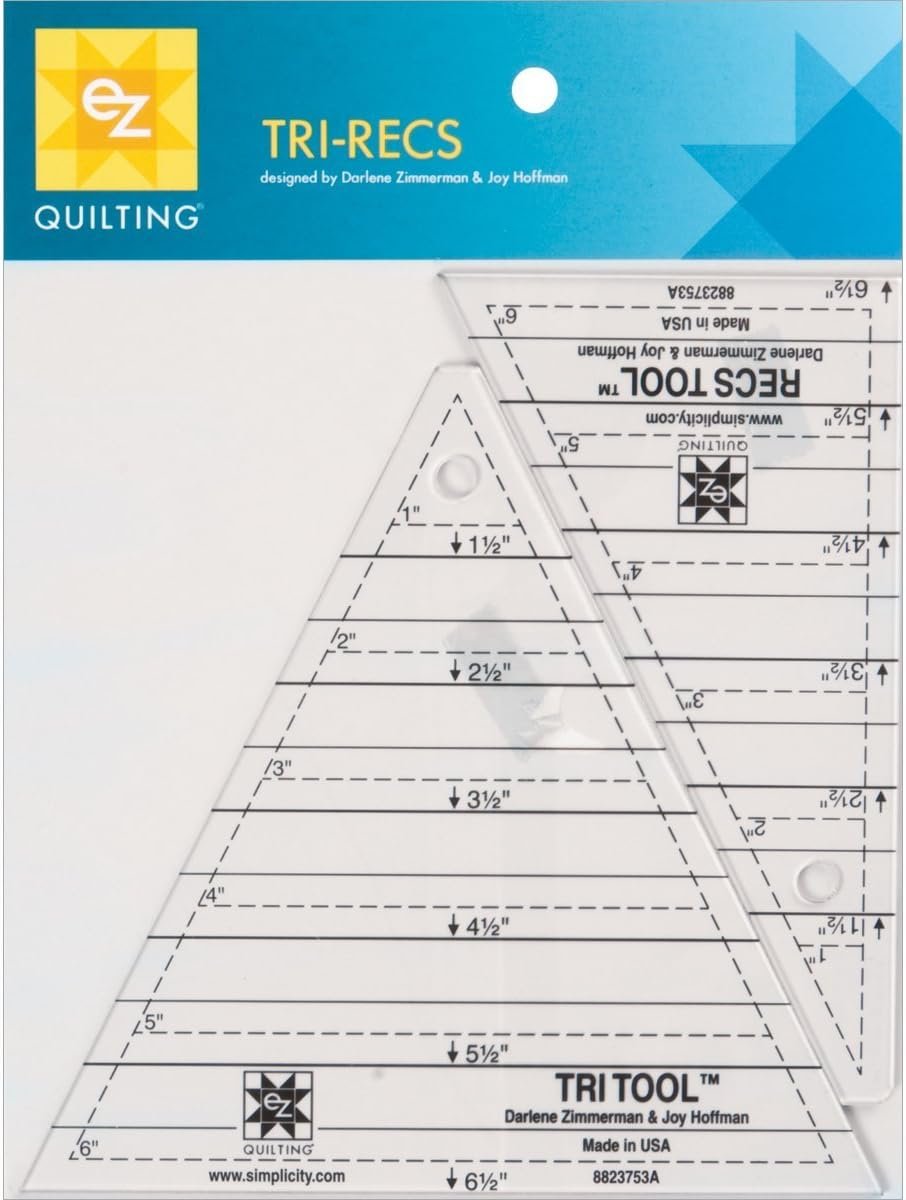 Tri-recs tools are thick and sturdy so they will stand up to years of wear. This 2 piece set makes it easy to make Triangles within squares and divided rectangles. Also includes an instruction booklet. Includes one 6 by 6-3/4 by 6-3/4 triangle with 1/4 seam allowance built in and one 6-1/2 by 3 by 6-inch Rectangle with 1/4 seam allowance built in.
