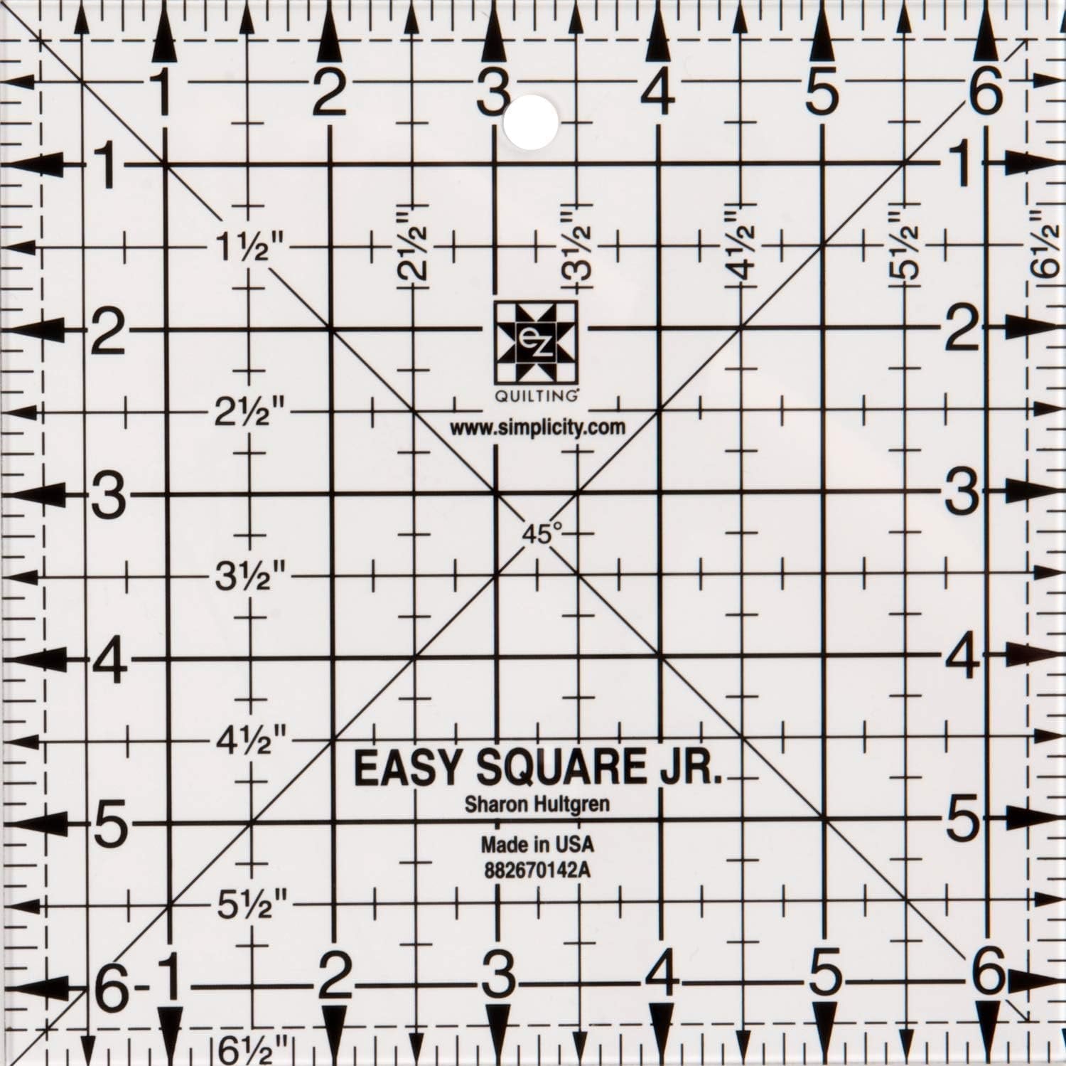 Wrights easy square Junior is great for blocking squares up to 6-inch. Marked with 45° angle lines. Easy to read numbers. Include in 1/4 seam allowance. Ideal for use with rotary cutter. Measures 6-1/2-inch length by 6-1/2-inch width.