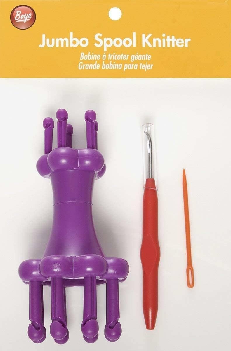 Boye Jumbo Spool Knitter. For anyone who has wanted to learn how to knit but struggled with the needles--now you can knit with a loom and a hook. No knitting needles required! Make cording belts scarves and even flowers with this Jumbo Spool Knitter. One end of the tool has five pegs with a 1 inch diameter the other end has eight pegs with a 2 inch diameter. Each package contains one plastic spool knitter one hook one needle and instructions. Imported.