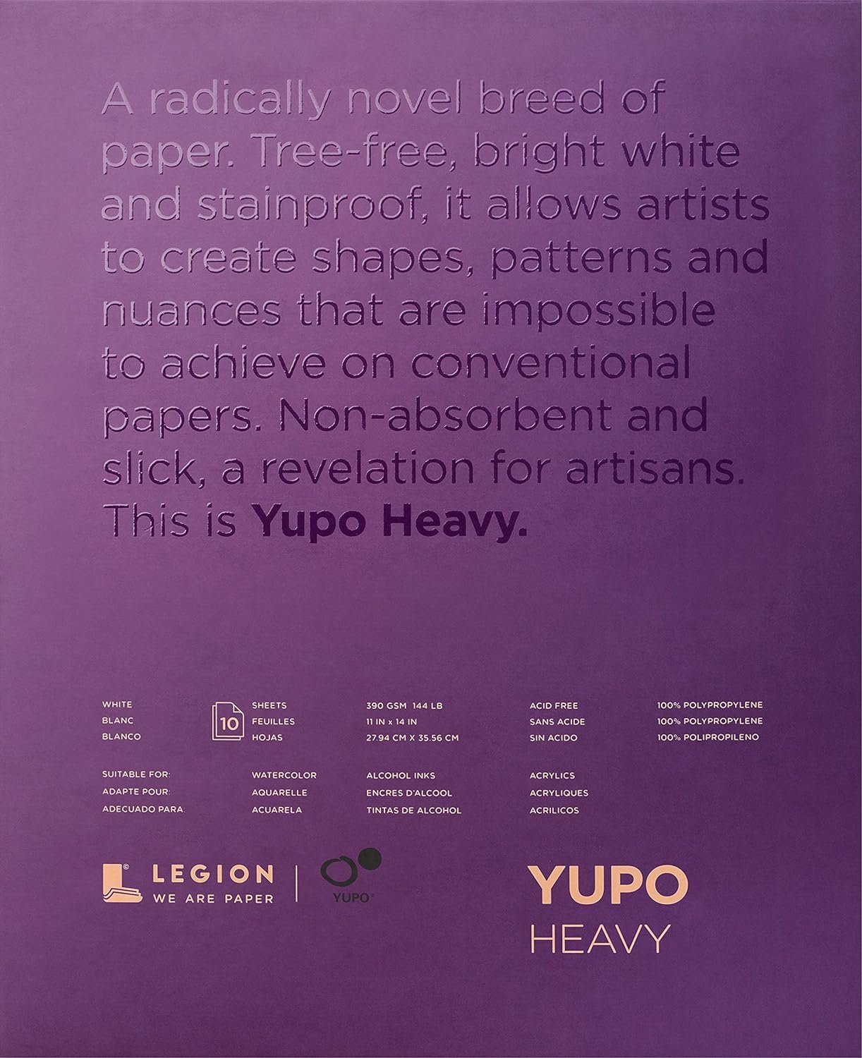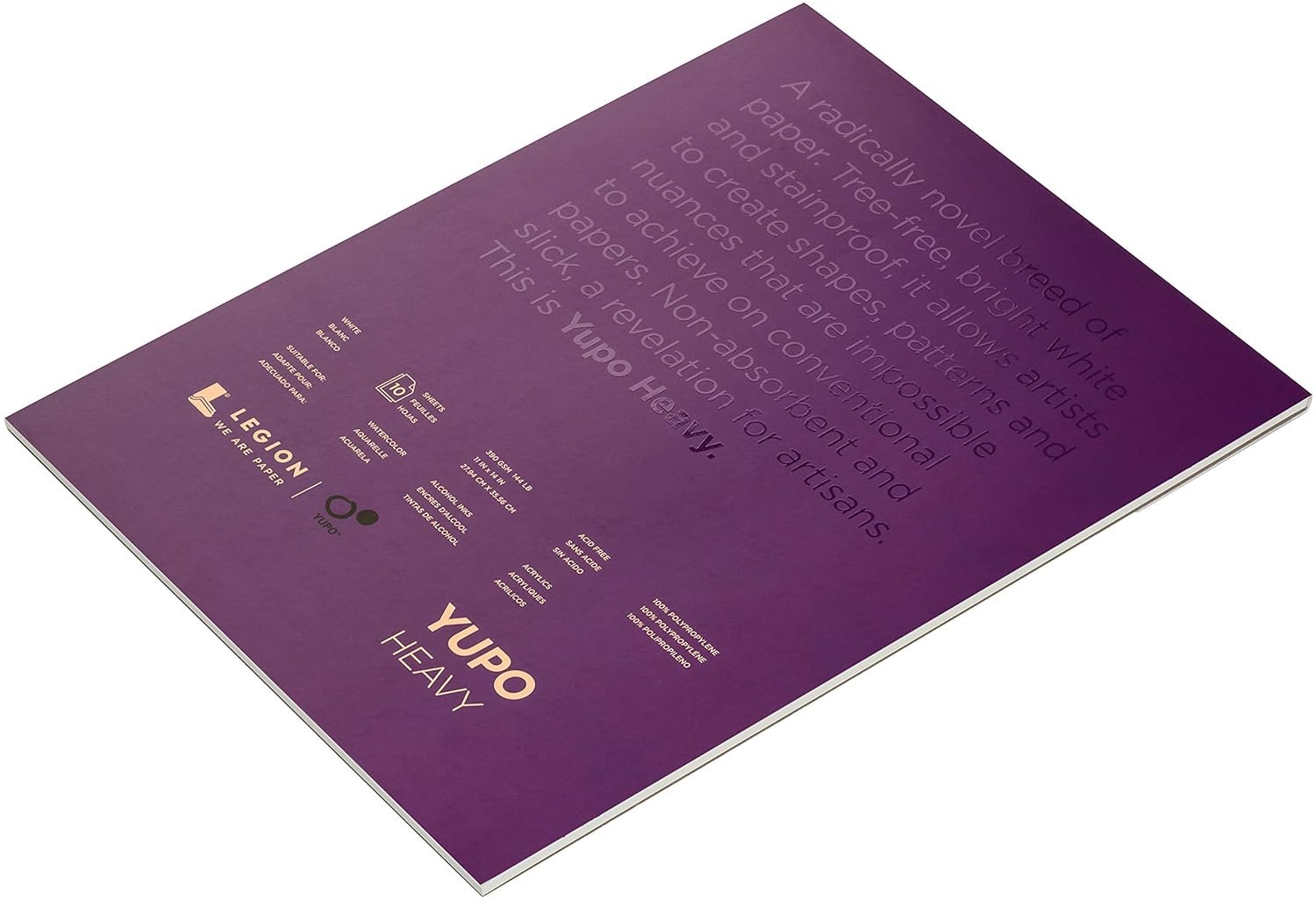10-sheet heavyweight white pad. Neutral pH acid-free waterproof and recyclable. Made from polypropylene. Made in USA. An ultra-smooth slick incredibly strong non-porous polypropylene substrate that repels water. Work in several different mediums to achieve unique and creative results. Painting or drawing on this surface will require some adjustments by the artist. The surface may be wiped clean to restore the original white of the sheet making it an excellent surface for beginners or for advanced and experimental artists wanting to capture nuances patterns and shapes. Yupo exhibits a unique lifting quality so it is possible to redo specific areas over and over again or build up layers of paint like an oil painter working on a canvas and then take them off to reveal the white of the sheet. Remember that water activates the paint even paint put down months ago. Allow YUPO to dry completely. Spray YUPO with a finishing spray to seal and protect it. Only use a sealant when your work is complete as rework and touch-ups become difficult to do after sealing. Can be used for acrylic or watercolor paints alcohol inks oil pastels pencil graphite or printing techniques (monotype offset silkscreen).