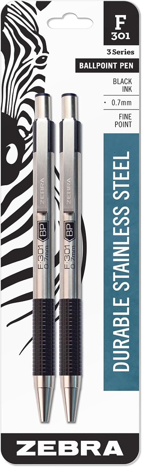 Zebra Pen F-301 Retractable Ballpoint Pen, Stainless Steel Barrel, Fine Point, 0.7mm, Black Ink, 2-Pack