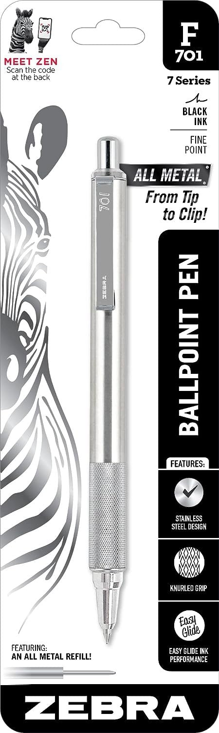 Zebra Pen F-701 Retractable Ballpoint Pen, Stainless Steel Barrel, Fine Point, 0.8mm, Black Ink, 1-Pack